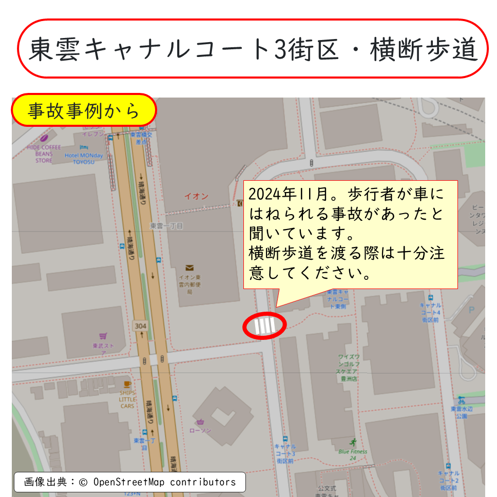 特にこの北側の横断歩道は、北にイオン、東に東雲キャナルコート CODANへの通路ということもあり、子どもやベビーカーなどの通行も多い横断歩道になっています。