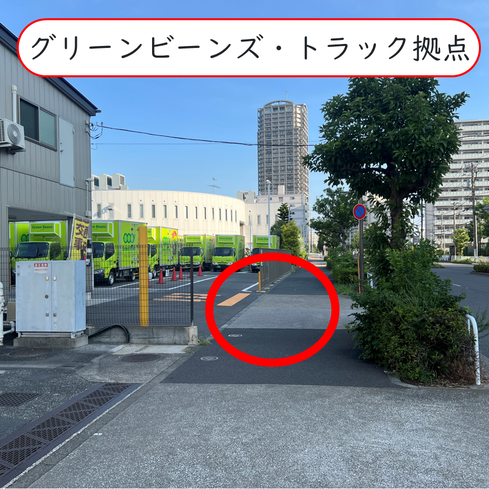 二辰小と辰巳橋の間に、イオン グリーンビーンズさんのトラック拠点があります。